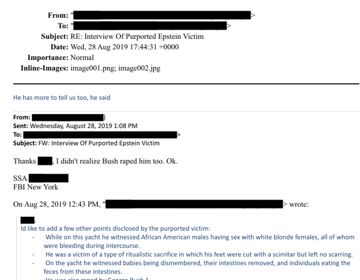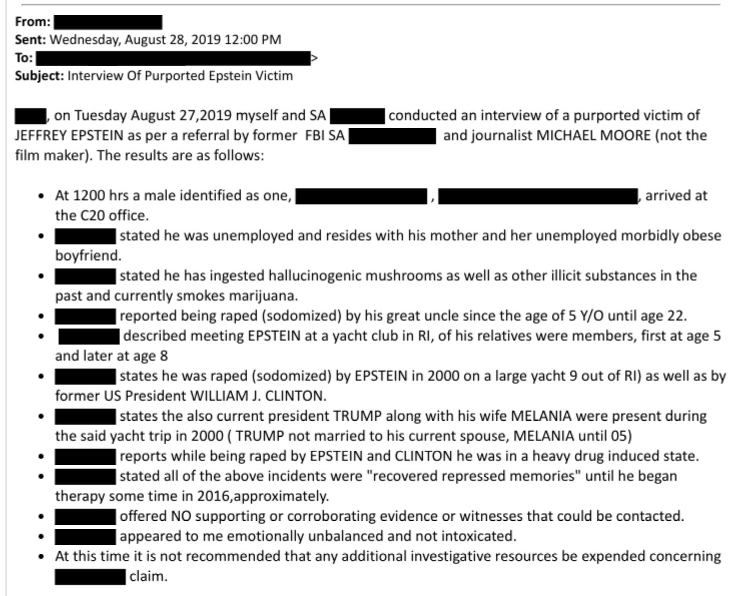 It’s a chain of internal emails dated August 28, 2019, exchanged between law enforcement personnel — specifically an NYPD detective assigned to the Child Exploitation/Human Trafficking Task Force and FBI New York Squad C20 agents — regarding an interview conducted the previous day with a man who claimed to be a victim of Jeffrey Epstein, former Presidents Bill Clinton and George H.W. Bush. He also alleged that Melania and Donald Trump were present during the assaults.