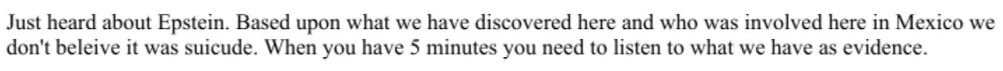 Just heard about Epstein. Based upon what we have discovered here and who was involved here in Mexico we don’t believe it was suicide. When you have 5 minutes you need to listen to what we have as evidence.