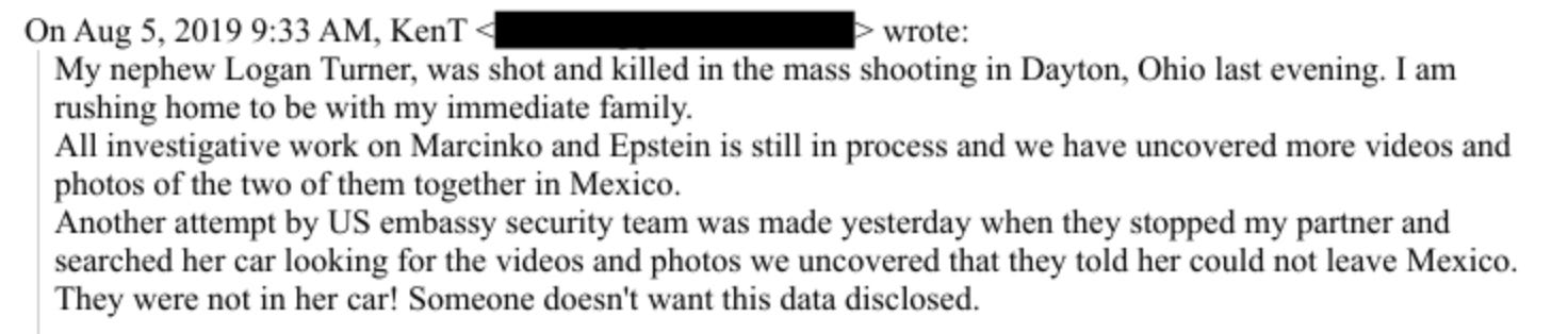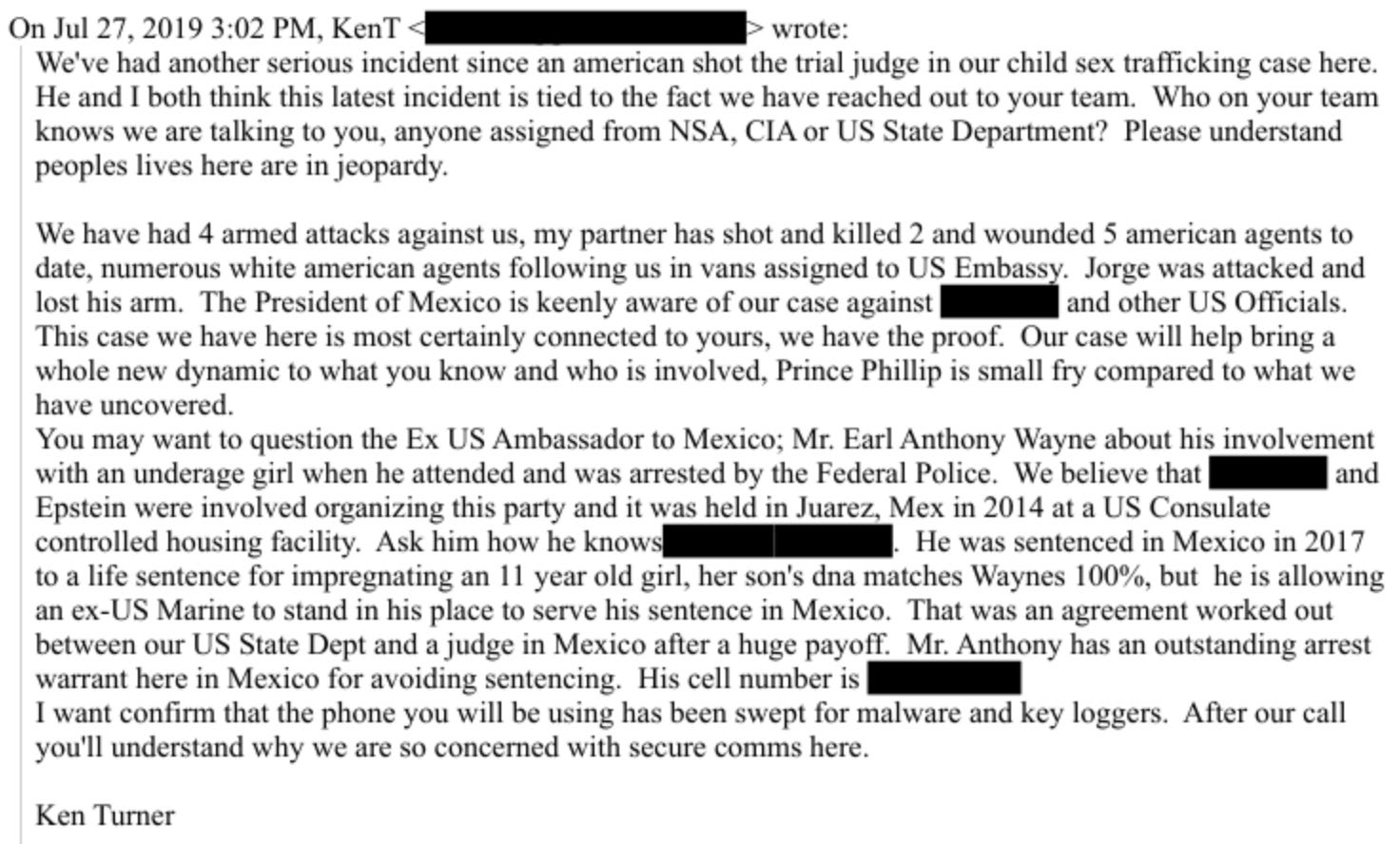 On July 27th, 2019, 2 weeks before Jeffrey Epstein “killed” himself, an investigator named Ken Turner sent an alarming message to a U.S. contact, describing escalating violence and apparent interference tied to an investigation unfolding in Mexico.