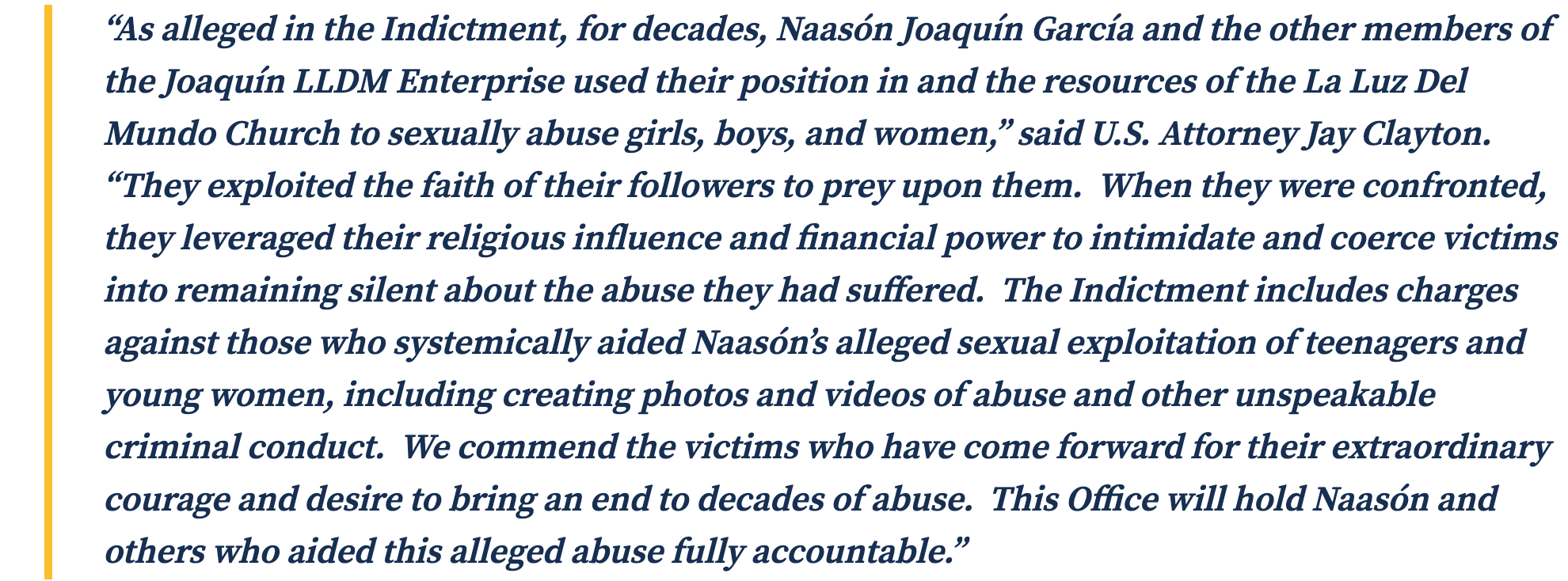 For decades, in the United States, Mexico, and elsewhere around the world, NAASÓN, SOSA, RANGEL GARCÍA, GARCÍA DE JOAQUÍN, NÚÑEZ JOAQUÍN, and GARCÍA PEÑA abused the power, doctrine, and structure of the LLDM Church to threaten, coerce, and sexually abuse girls, boys, and women in the LLDM Church; to engage in financial crimes; and to obstruct criminal investigations into their misdeeds.