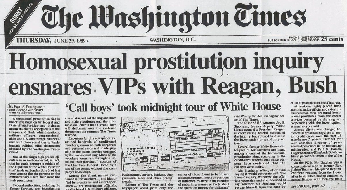“Homosexual Prostitution Inquiry Ensnares VIPs with Reagan, Bush.”