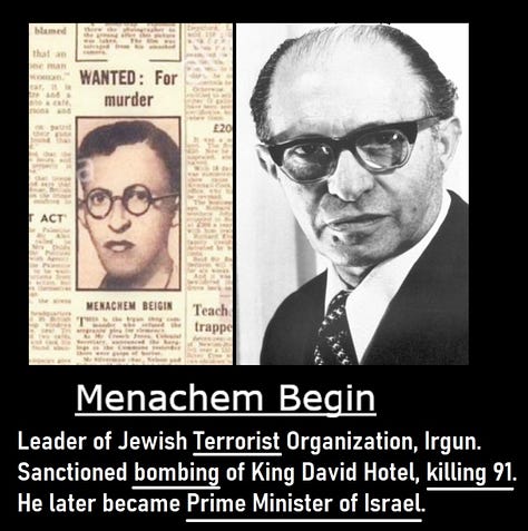 So when people repeat the line that “terrorism was born in the Middle East,” they’re only telling half the story. What’s consistently left out is who was first labeled a terrorist (Zionist militias), who later became heads of state (Begin & Ben-Gurion), and which terrorist groups were folded directly into a modern national army (the IDF).