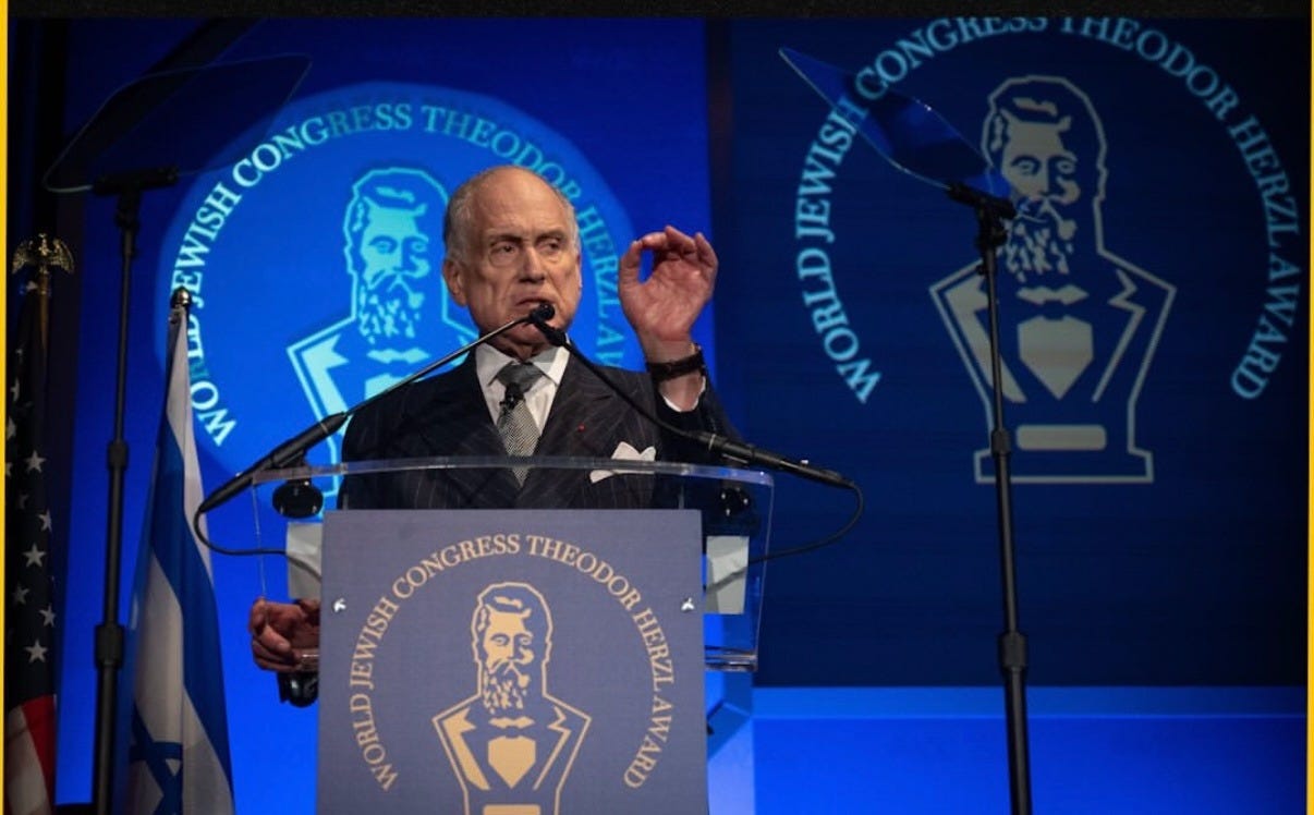 Lauder was elected President of the World Jewish Congress in 2007. In December of 2025 he gave a speech at the World Jewish Congress boasting about the steps his organization has taken to push governments and social media platforms to “fight antisemitism”.